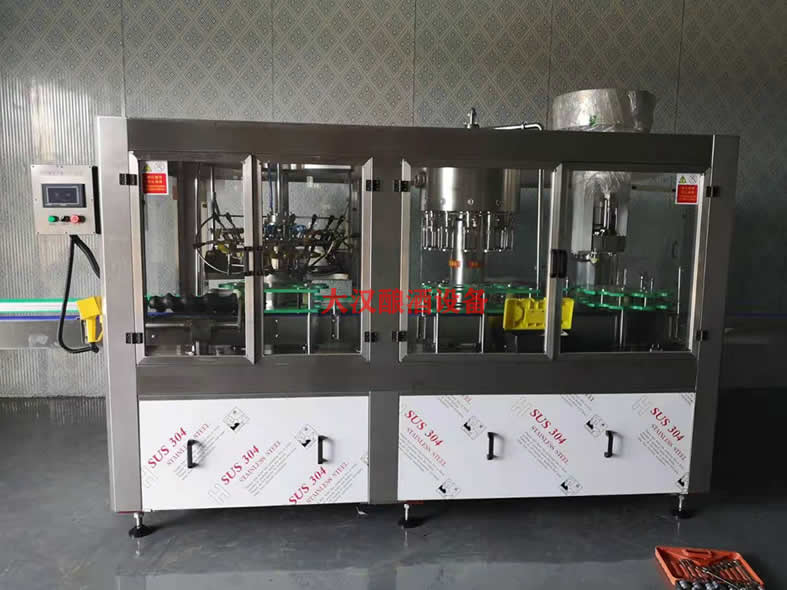 產品介紹該機是在技術質量過硬的單機基(jī)礎上,將12頭全自動(dòng)翻轉式衝(chōng)瓶(píng)機、12頭全自動等位(wèi)式灌裝機(前部配有單頭抽真空充氮氣(qì)裝置)與單頭全自動打塞機結合在一(yī)起的三機聯體設備,使設備(bèi)間的動(dòng)力一致,進出瓶平穩一致,中間環節無(wú)擠瓶堆瓶現象,不易倒瓶、短路徑、故障率低(dī)、效率高、省人省電,解決了設備間(jiān)傳動費工(gōng)費時(shí)缺陷,它適用於不含氣體的如各種果酒、保健酒、飲料(liào)和(hé)調味品等液體的灌裝,特別適用於容器比較高液位比較準的灌裝。主要特點A、衝瓶機(jī)特點: (1)采用彈性強力機械手抓瓶、翻瓶、衝瓶、空瓶、翻轉(zhuǎn)複位、出瓶等(děng)工序(xù),實現了全自動化生產。 (2)機械手衝壓(yā)件、鑄件材料均采用國標優質304/316材質,保證了材料的(de)耐(nài)腐蝕性。 (3)連續跟蹤式(shì)衝瓶效率高、衝洗效果穩定可靠(kào)。 (4)機械手具有抓瓶(píng)定位準確,翻(fān)轉活動自如等特點,衝水閥密封性能好,衝瓶力度大衝瓶對中性準等(děng)優點。 (5)進出瓶(píng)采用數控加(jiā)工中心製作的導瓶螺杆及撥瓶輪,將瓶(píng)子準確導(dǎo)入進瓶導軌,解決了擠瓶、卡瓶、堵瓶、破瓶的難題。 (6)隻需按動升降按扭及更換相應瓶徑(jìng)撥瓶輪後,即可更換不同瓶徑,瓶高的瓶子。 B、灌裝機特點(diǎn): (1) 效率高:變頻調(diào)速,生產能力最快可達150~170瓶/小時/閥。. C、打塞機主要特點: (1) 結構設計新穎、緊(jǐn)湊,工作(zuò)可靠。維修方便,故障少,設備壽命長。 (2)自(zì)動化程度高,理塞、送塞、擠塞(sāi)、打塞均自動連(lián)續進行,各項動作協調一致。 (3) 根據瓶型高度,調整打塞高度,適用瓶型高度範(fàn)圍廣。 (4) 進瓶、壓塞過程有過載保護,防(fáng)止破瓶損機。不進瓶,不(bú)下塞,有(yǒu)效防止木塞的浪費。功能用途A、衝瓶機特點: (1)采用彈(dàn)性強力機械手抓瓶、翻(fān)瓶(píng)、衝瓶、空瓶、翻轉複位、出瓶等工序,實現了全自動(dòng)化生產。 (2)機械(xiè)手衝壓件(jiàn)、鑄件材料(liào)均采用國標優質304/316材質,保證了材料的(de)耐(nài)腐蝕性。 (3)連續跟蹤式衝瓶效率高(gāo)、衝洗效果(guǒ)穩(wěn)定可靠。 (4)機(jī)械手具有抓瓶(píng)定位準(zhǔn)確,翻轉活動自如等特點,衝水閥密封性能好,衝瓶力度大衝瓶對(duì)中性準(zhǔn)等優點。 (5)進出瓶采用(yòng)數(shù)控加工中心製(zhì)作的導瓶螺杆及撥瓶輪,將瓶子準確導入進瓶導軌,解決了擠瓶、卡瓶、堵瓶、破瓶的難題。 (6)隻需按動(dòng)升降按(àn)扭及更換相應瓶徑撥(bō)瓶輪後(hòu),即可更換不同瓶徑,瓶高的瓶子。 B、灌裝機特點: (1) 效率高:變頻調速(sù),生產能力最快可達150~170瓶/小時/閥。. C、打塞機主要特(tè)點: (1) 結構設計新穎(yǐng)、緊湊,工作可靠。維修方便,故障少,設備壽命長。 (2)自(zì)動化程度高,理塞、送塞(sāi)、擠塞、打塞均自動連續進行,各項動作協調(diào)一致。 (3) 根據瓶型高度,調整打(dǎ)塞高度,適用瓶型高度範圍廣。 (4) 進瓶、壓塞過程有(yǒu)過載保護,防止破瓶損機。不進瓶,不下塞(sāi),有效防(fáng)止木塞的浪費。其他說明公司(sī)主要產品有:白酒灌裝生產成套設備、果酒灌裝生(shēng)產成套設備,聯動控製係統、同步(bù)機械傳遞係統(tǒng)、無壓力輸送係(xì)統、立體傳輸係統等。 鵬程機械竭誠與各方朋友建立友(yǒu)好合作關係,共同發展(zhǎn),共創大業!