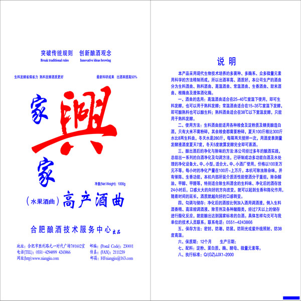 家家興國家注冊(cè)商標屬於合肥蜜芽my77738-(hàn)釀酒技術服務中心"家家興"第四代高(gāo)產酒曲2010.7.1.正式上市!第四代酒曲為真空(kōng)包裝,解決(jué)了運輸問題。第四代酒曲最大優點出酒率高(gāo)、酒質好、發酵時間縮短、耐高低溫。歡迎新老(lǎo)顧客訂購!新顧客初期可(kě)以買1公斤試用(yòng)!(1公斤酒(jiǔ)曲20元加 EMS特快費用36元合計56元)。"家家興(xìng)"酒曲酒曲適用於(yú)大米(mǐ)、玉米、高梁、木薯、小麥等為原料,不經過蒸煮,直接加水,就能 在常溫下進行發酵成酒,出酒率比傳統方(fāng)法提高40%以上(shàng),酒香濃鬱、口味純正、綿甜爽、不帶酸(suān)、辣(là)、苦及生料味等,不加(jiā)任何香料勾兌喝後沒有漲腦和頭痛現象,完全符合國家QB942-84白酒標準,它也可直接應用於釀製(zhì)各種米酒、小曲酒、大曲酒,以代替傳統酒曲、酒餅、糖化酶、在保證原有(yǒu)酒質(zhì)風味的基礎(chǔ)上,大大提高了出酒率,使產品增加了強大(dà)的市場競爭力。